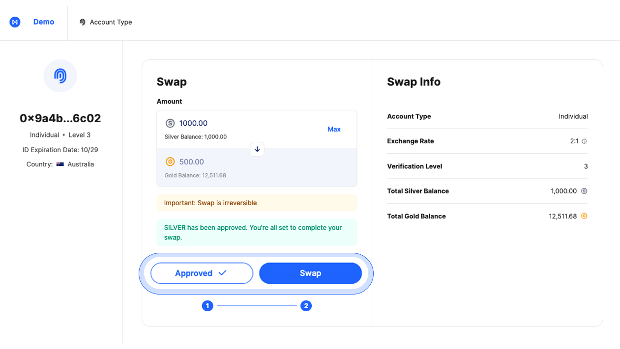 2. **Swap process**: Convert your Silver tokens into Gold Tokens by selecting the amount you wish to swap and confirming the transaction. Note that this is a one-way process, and Gold Tokens cannot be converted back into Silver Tokens.