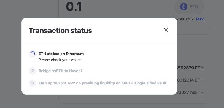 At the moment, holding hsETH makes you eligible for Haven1's airdrop, offering additional incentives for early and active participation. Once Haven1 launches mainnet, you will be able to earn potentially double digit returns by deploying hsETH in different protocols on Haven1 network.