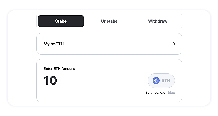 Note that as hsETH accrues staking rewards, it will rebase and gain in value against ETH. We’ll show you exactly how much hsETH you’re getting back before your stake.&#x20;